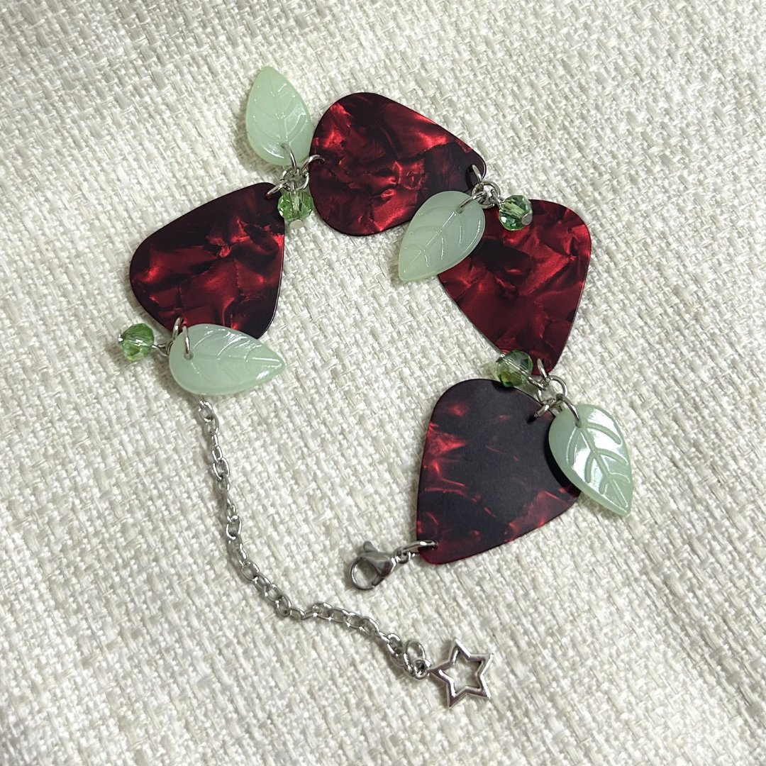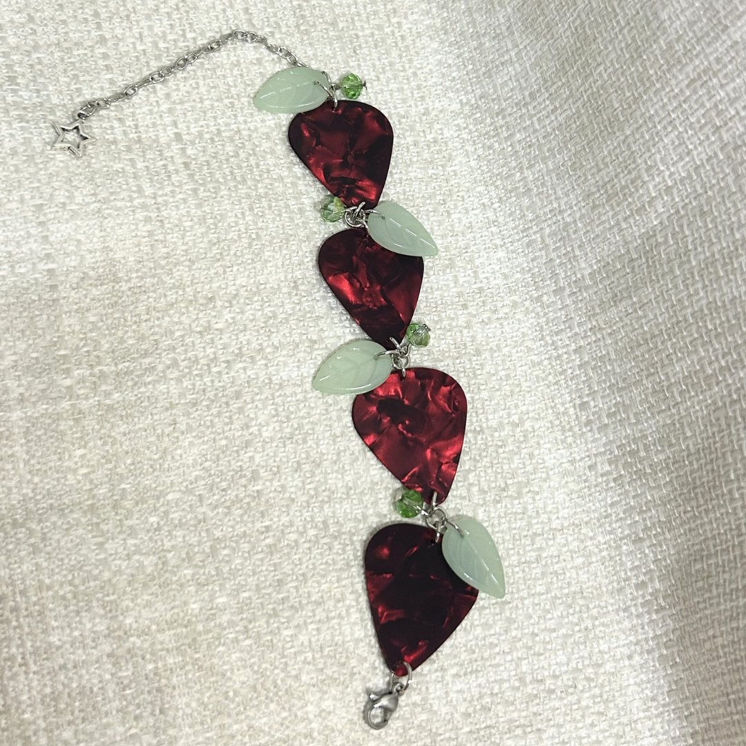 This handmade bracelet features guitar picks inspired by strawberries. π