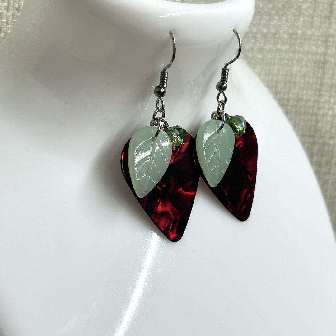 These handmade earrings feature guitar picks inspired by strawberries. π