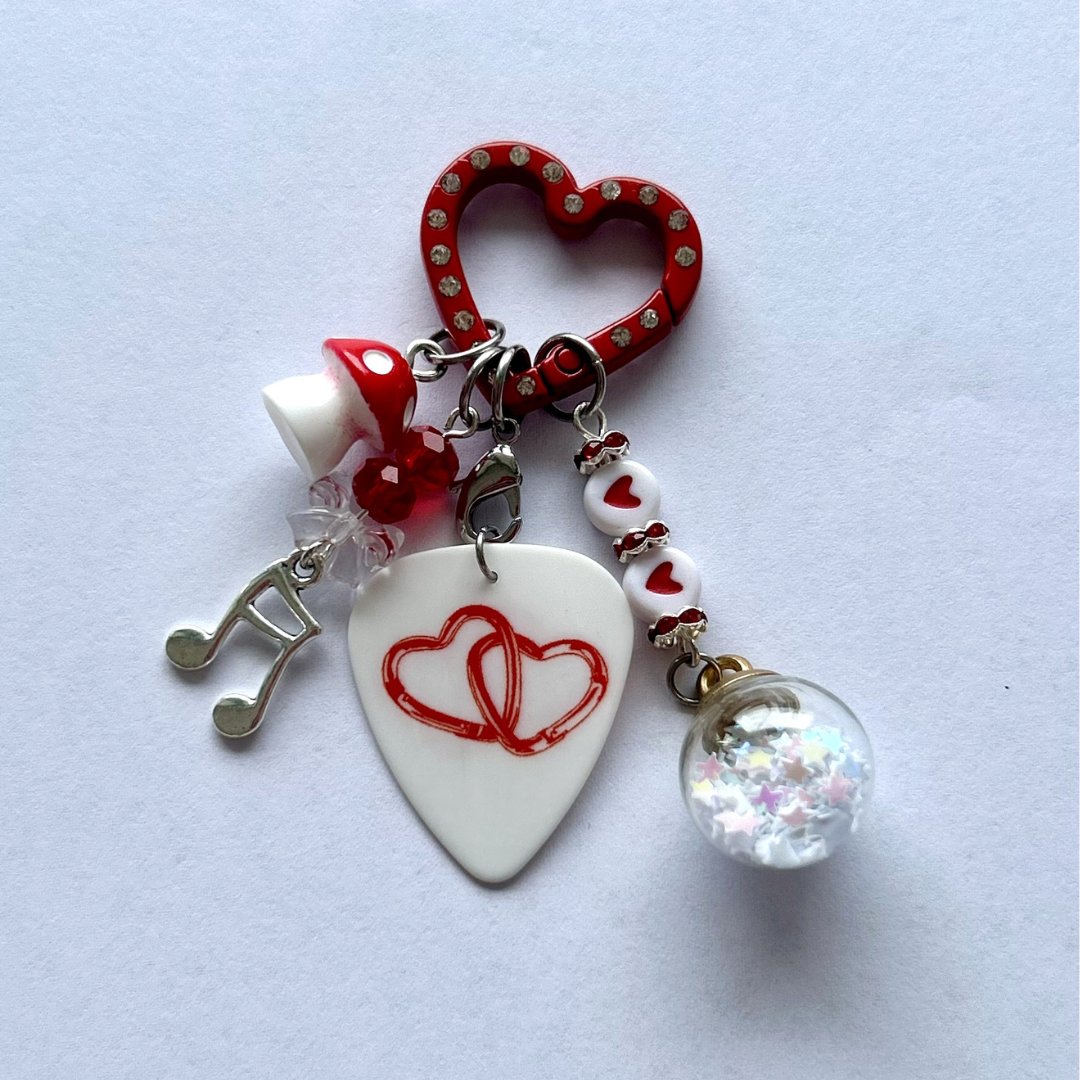 This handmade keyring features a cute detachable guitar pick (for any rock 'n' roll emergencies!) π